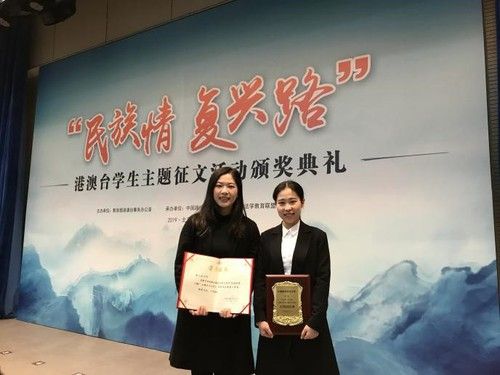 (通讯员 李一帆)1月8日,由教育部主办的“民族情,复兴路”港澳台学生主题征文活动颁奖典礼在中国政法大学举行,我校荣获组织奖,其中我院2015级国际经济与贸易专业学生黄玉瑶同学荣获二等奖。