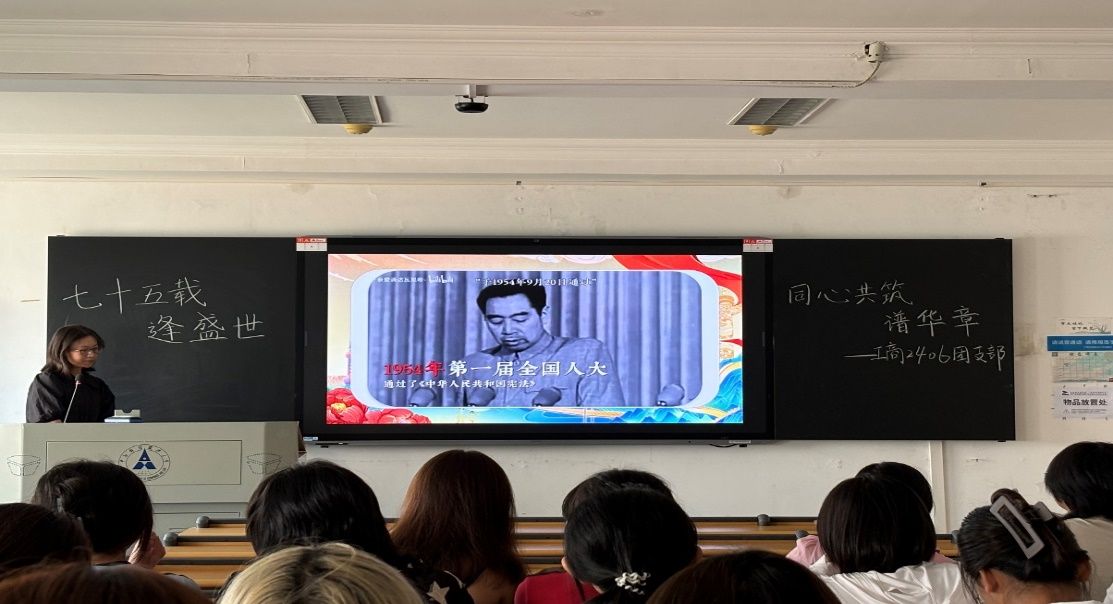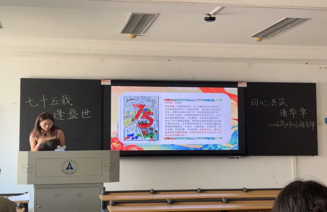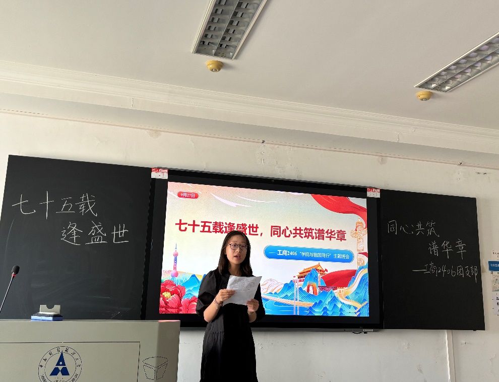 (摄影:葛珈佃)为热烈庆祝新中国成立75周年,2024年9月27日上午10点,永兴娱乐app工商管理类2406班9月主题团日活动在文津楼顺利召开。团支书李佳欣同学担任本次会议的主持人。