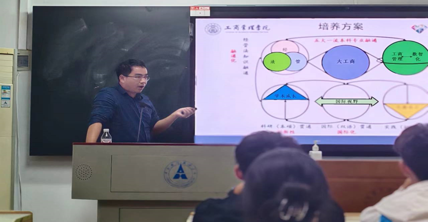 接着,吕飞老师详细说明了针对于工商实验班的培养方案,从大工商、学术视野、国际与本土等方面展现了我校融通化、创新性、国际化的办学理念。吕飞老师表示,希望同学们成为“T”型人才,既要有思维广度,善于整合设计;又要有专业深度,学会根源思考,实现我院“精管理、通财务、善投资、懂法律”的复合型人才培养目标。