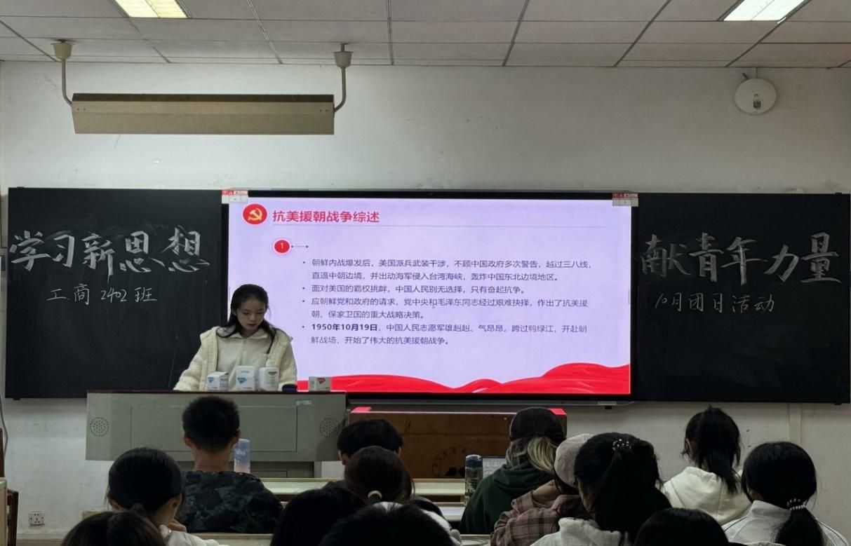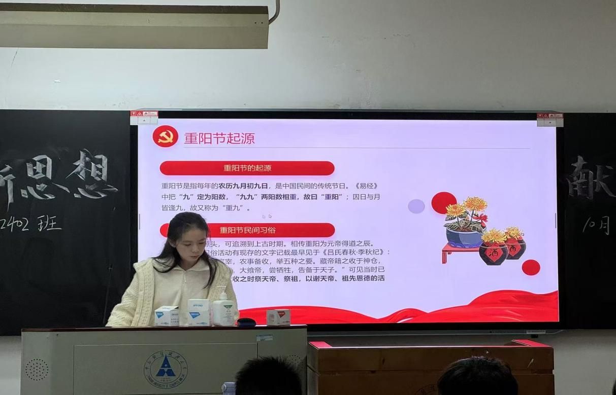 随后,高若茗同学作为主持人,首先带领大家回溯了抗美援朝战争的烽火岁月,深刻阐述了抗美援朝精神在新时代的价值与意义,激发了他们强烈的民族自豪感与归属感。紧接着,通过观看《中华民族共同体概论》,高若茗同学进一步强化了同学们对民族团结重要性的认识,深化了大家对中华民族共同体这一伟大理念的认同与理解,共同绘制着民族团结的同心圆。在此基础上,她宣读了《天下情怀,推动构建人类命运共同体》,引发同学们对人类命运共同体的深远影响与重大价值的深入思考,展现了新时代青年的广阔视野与博大胸怀。此外,正值重阳佳节,这个承载着敬老爱老传统美德的节日,也为本次活动增添了一抹温情。同学们在活动中深刻领悟到敬老爱老的社会责任,内心涌动着关爱老人的暖流,誓言要将这份美德传承下去,让尊老敬老之风在新时代焕发出更加璀璨的光芒,历久弥新,照亮前行的道路。