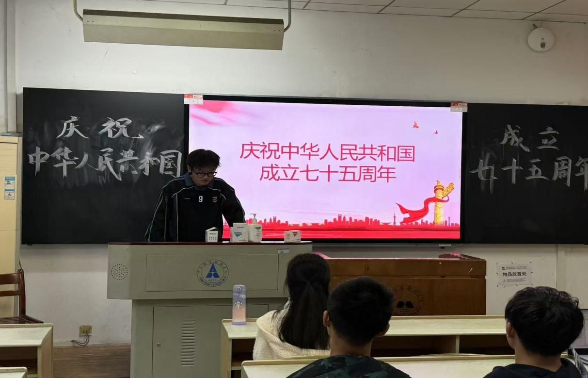 为了庆祝中华人民共和国成立七十五周年,在活动的尾声,工商2402班班长韦烨以满腔的热情与自豪,回顾了祖国波澜壮阔的发展历史。并以此为契机,向工商2402班全体同学发出号召,要秉承“谦虚谨慎,不骄不躁”的宝贵品质,持续不断的追求卓越,争做商菁,敢于奋斗,为祖国的繁荣昌盛贡献自己的青春力量。