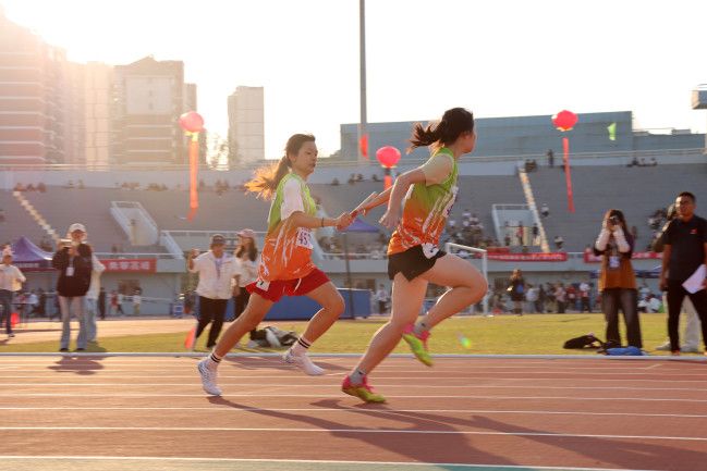 在女子4*100接力赛中,我院第一棒领先多人,最后一棒交接略有失误,但整体交接流畅顺利,取得第三名的佳绩。