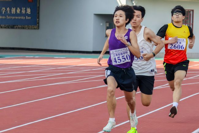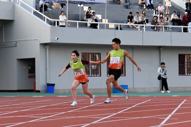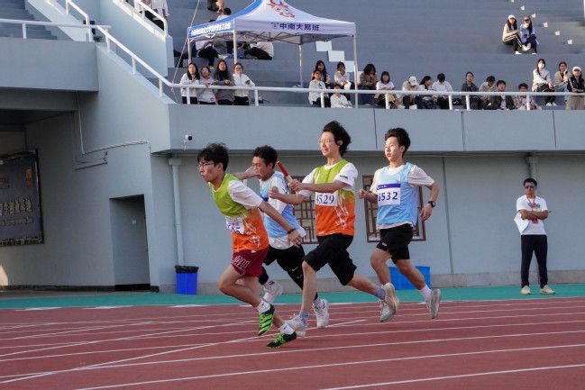 在男子4*100接力赛中,我院第一棒略有落后,之后各运动员奋起直追,展现出高超的弯道技巧,获得第四名的好成绩。